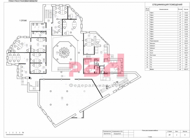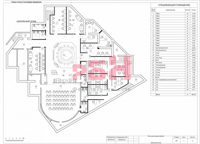 - площадь цоколя составляет 662,83 кв.м, площадь 1-го этажа 628,57 кв.м, площадь 2-го этажа 680,86 кв.м