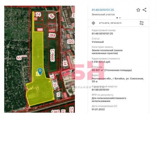 Земельный участок промышленного назначения площадью 1000 соток по адресу г. Батайск, ул. Совхозная, 20а