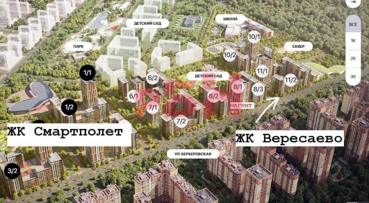 - общая застройка - 30 000 квартир (ЖК Полет, Эстет, Сияние, Движение)