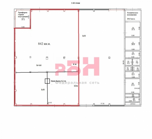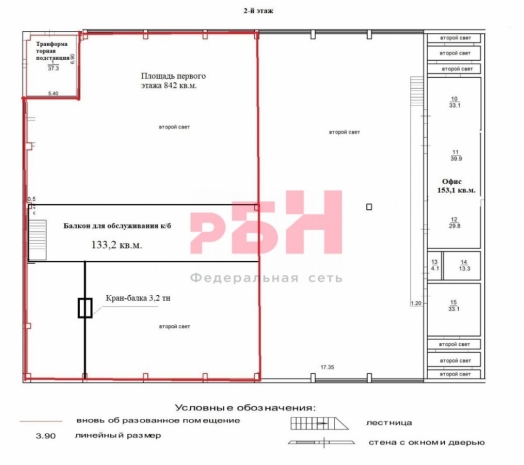 - полезная производственно-складская площадь 842 кв.м. с кран-балкой 3,2 тн, высотой 8 м до фермы